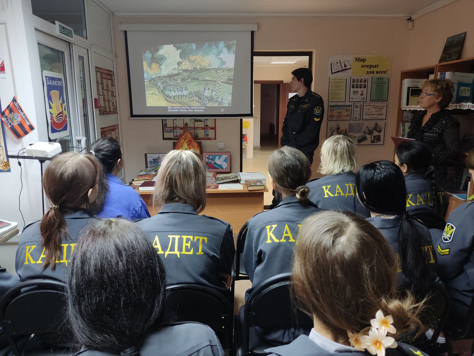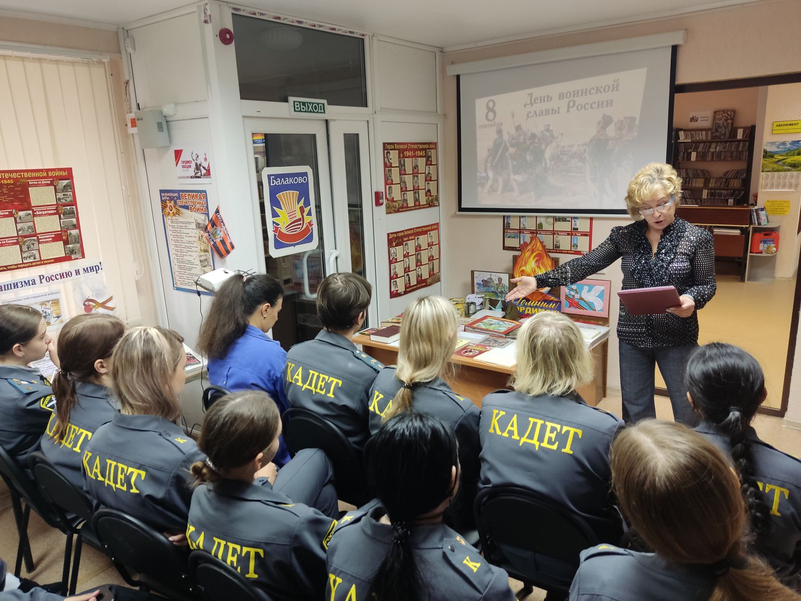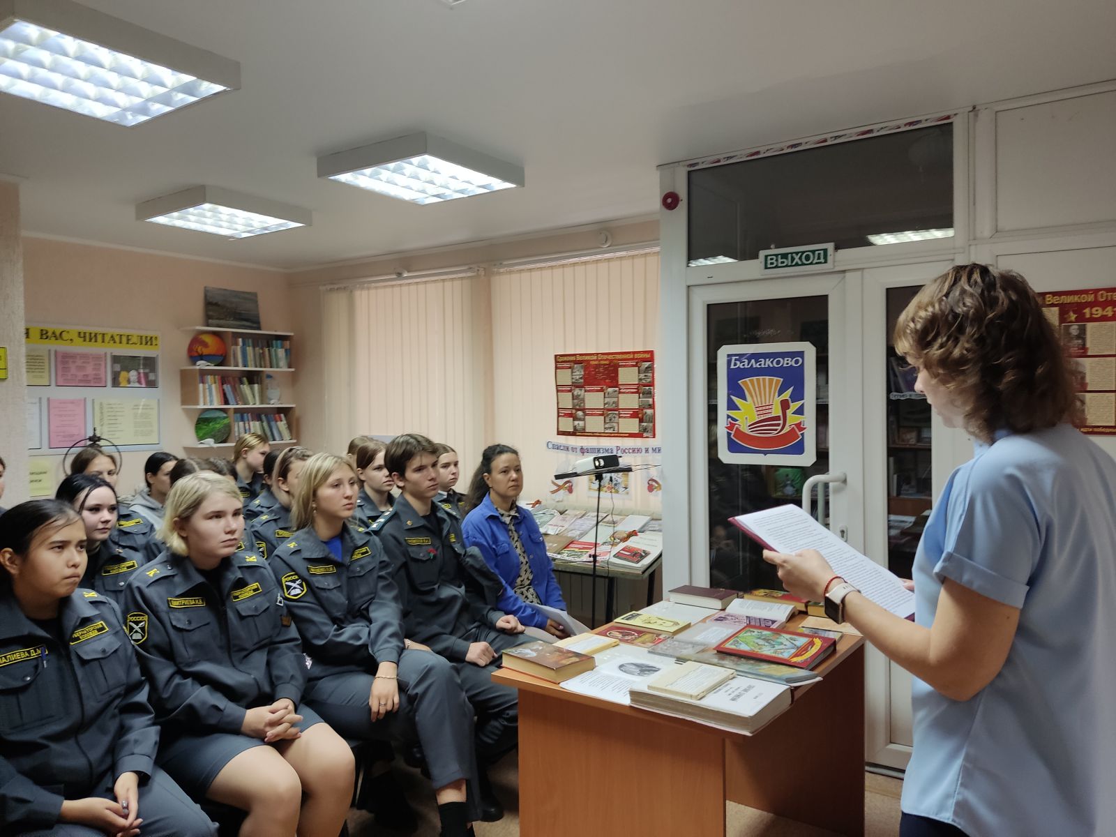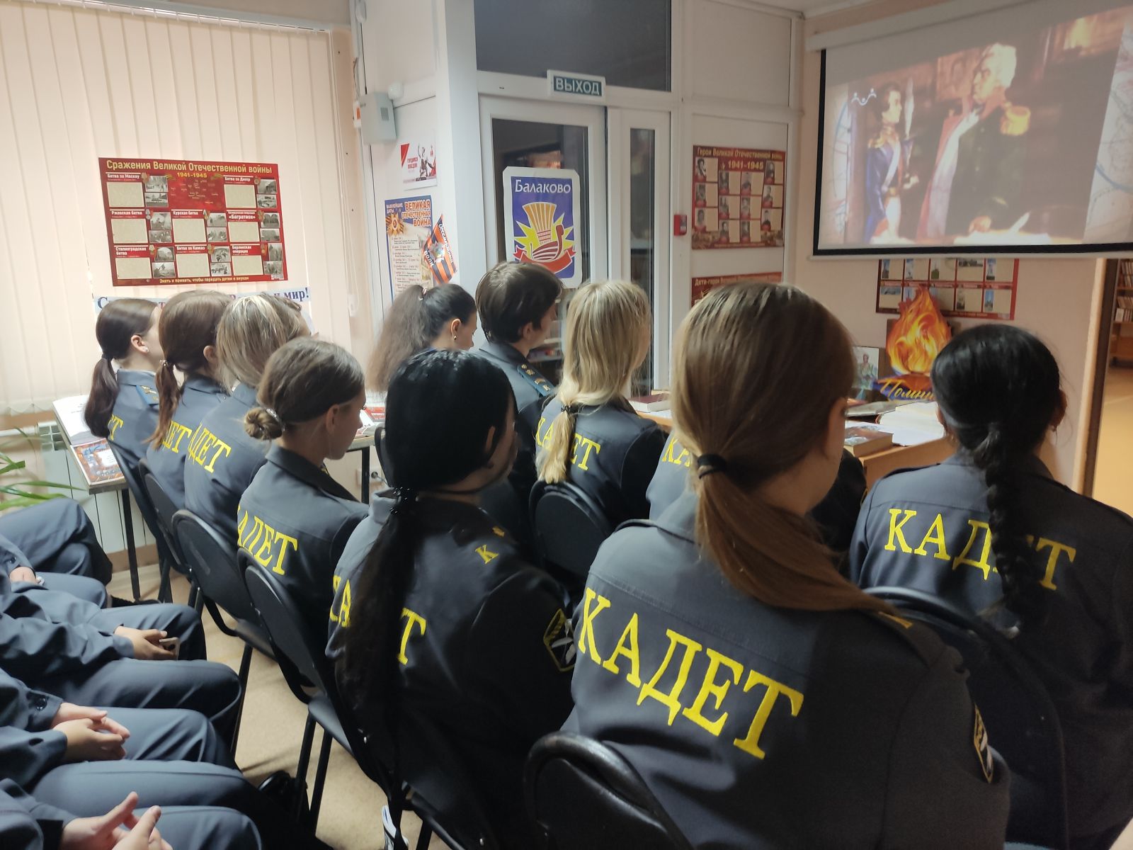 Балаковский филиал Областной специальной библиотеки для слепых подготовил для студентов ГАПОУ СО «Губернаторский колледж» панораму исторических событий «О Родине, о доблести, о славе», посвящённую Дню Бородинского сражения русской армии под командованием М. И. Кутузова с французской армией. Сотрудники рассказали о событиях Отечественной войны 1812 года, о главном сражении под Бородино, о легендарном полководце М. Кутузове, о прославленных героях П. Багратионе, Н. Раевском, Д. Давыдове, Н. Дуровой и других. Мультимедийная презентация и видеоматериалы помогли кадетам познакомиться с ключевыми событиями Бородинского сражения, больше узнать об истории нашего государства в этот период, ознакомиться с книгами специальной библиотеки для слепых разных форматов и на разных носителях, рассказывающих об огромном значении Бородинской битвы для российской и общемировой истории, и с книжно-иллюстративной выставкой «Наш народ – великий воин! Славы предков будь достоин!», посвящённой Году защитника Отечества.