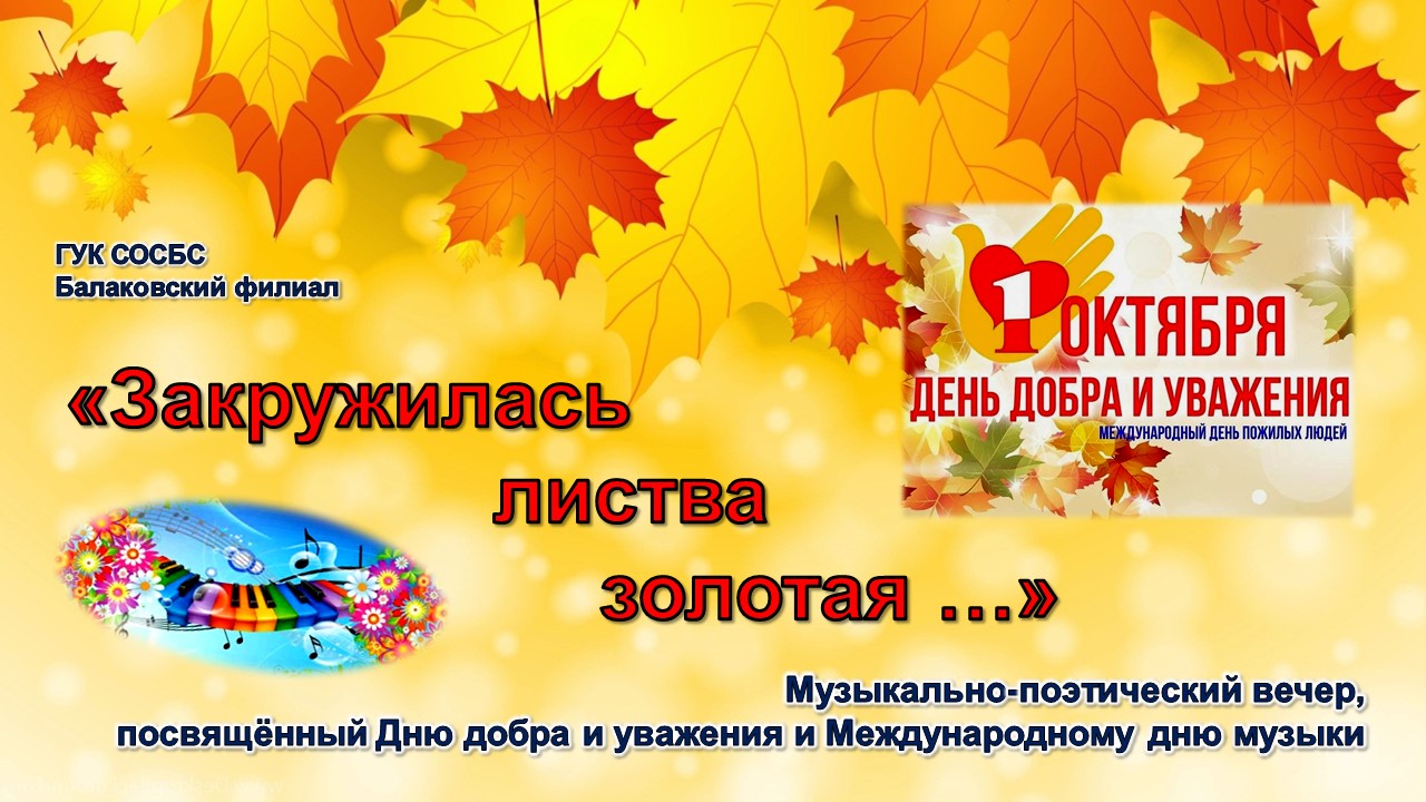Балаковский филиал Областной специальной библиотеки для слепых подготовил для читателей музыкально-поэтический вечер, посвящённый Дню добра и уважения и Международному дню музыки. Мероприятие «Закружилась листва золотая…» рассказало о возникновении праздников, познакомило с их историей и традициями. Свободный микрофон предоставил возможность желающим поделиться интересными историями из своей жизни и творчеством: вокальным и чтением поэтических произведений о семье, любви и дружбе.