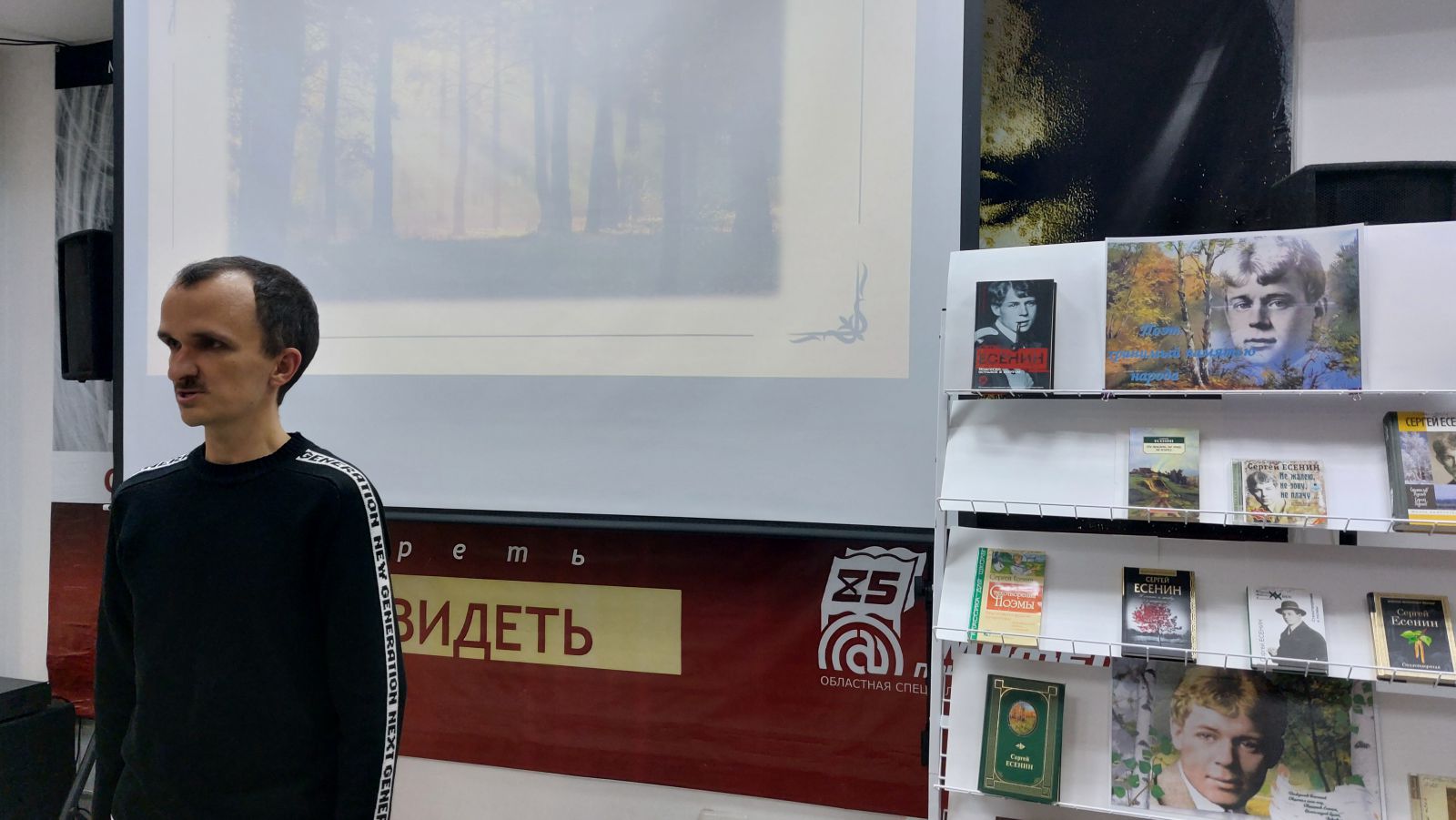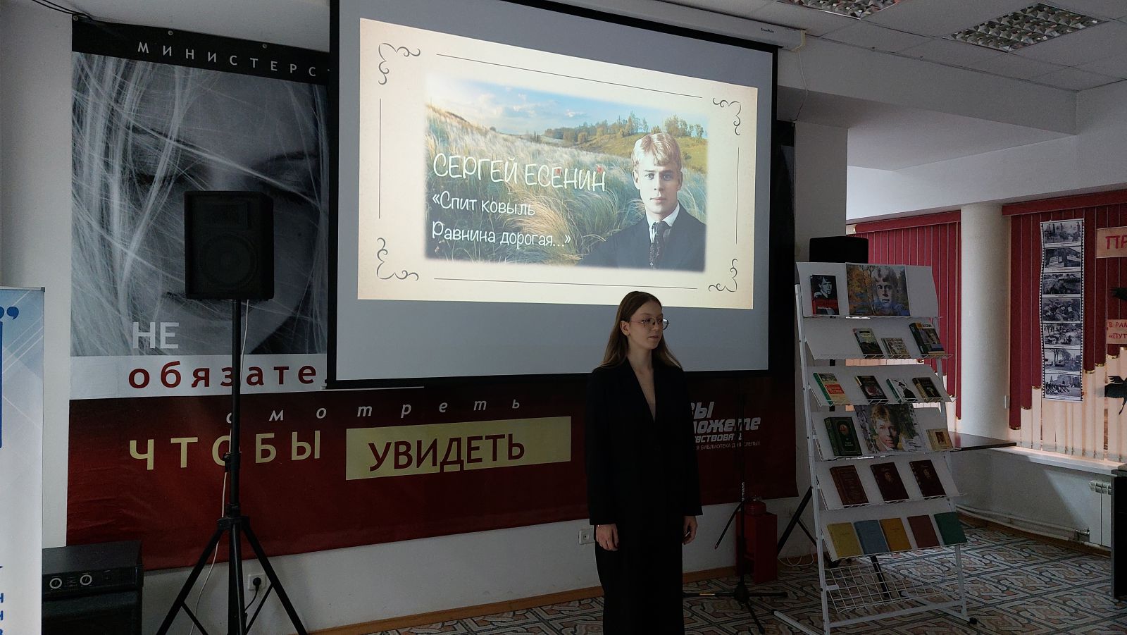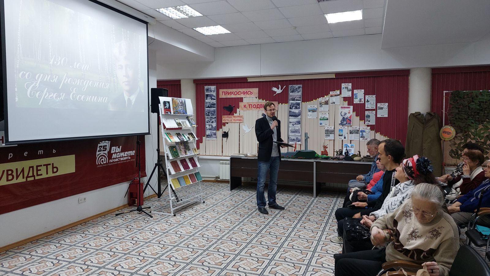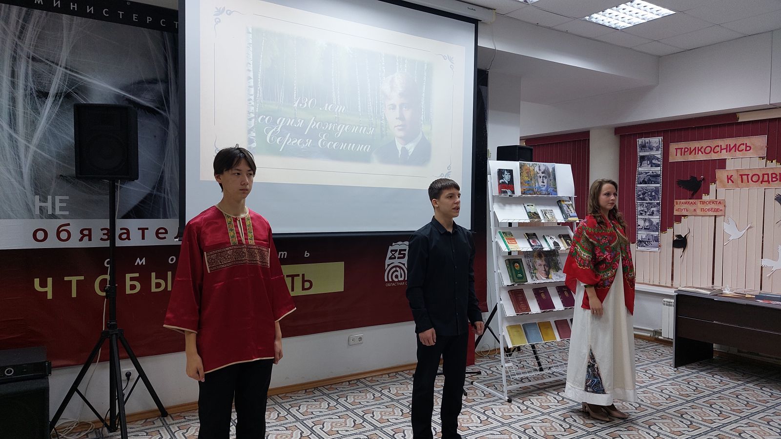 В честь юбилея великого русского поэта Сергея Есенина Областная специальная библиотека для слепых организовала музыкально-поэтическую встречу, которая собрала любителей поэзии, исследователей творчества поэта и всех ценителей русской литературы. В мероприятии приняли участие как молодые читатели, так и читатели старшего поколения, что говорит о неизменном интересе к поэзии Есенина. Участники вспомнили лирические стихи поэта и насладились красотой родной природы. Очень душевно прозвучали стихи в исполнении учеников Детско-юношеского центра Фрунзенского района г. Саратова: Тимофей Абрамов прочитал «Низкий дом с голубыми ставнями» и «Не жалею, не зову, не плачу», Платон Шарый исполнил «Собаке Качалова» («Дай, Джим, на счастье, лапу мне...»), Мария Напольникова подготовила стих «Спит ковыль, долина дорогая», Анна Лыкова прочитала стихи «Буря» и «Колдунья». Стихотворение «С добрым утром!» исполнил читатель библиотеки Роман Никонов. Заведующий отделом издательских и медиатехнологий Областной специальной библиотеки для слепых Геннадий Генералов прочёл замечательное стихотворение «Снова выплыли годы из мрака». Завершилась встреча прослушиванием сохранившейся записи с живым голосом поэта, где он читает стихотворение «Я покинул родимый дом».