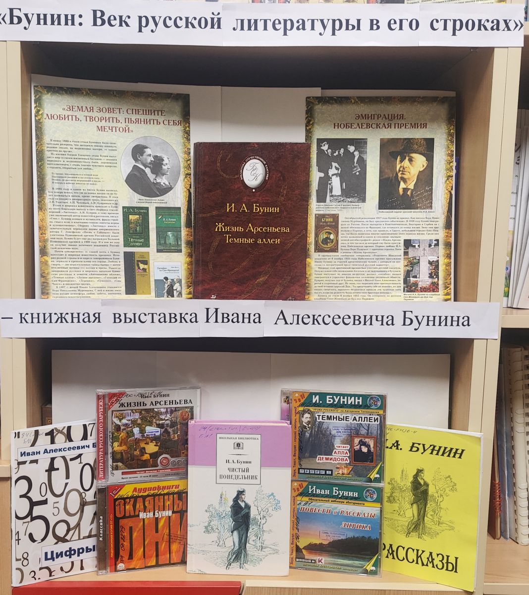 В этом году отмечается 155-летие со дня рождения Ивана Алексеевича Бунина, великого русского писателя и драматурга. В честь этого события в детско-юношеском секторе центра адаптивного чтения работает книжная выставка «Бунин: Век русской литературы в его строках». На выставке представлены произведения писателя в разных форматах и биографические материалы.