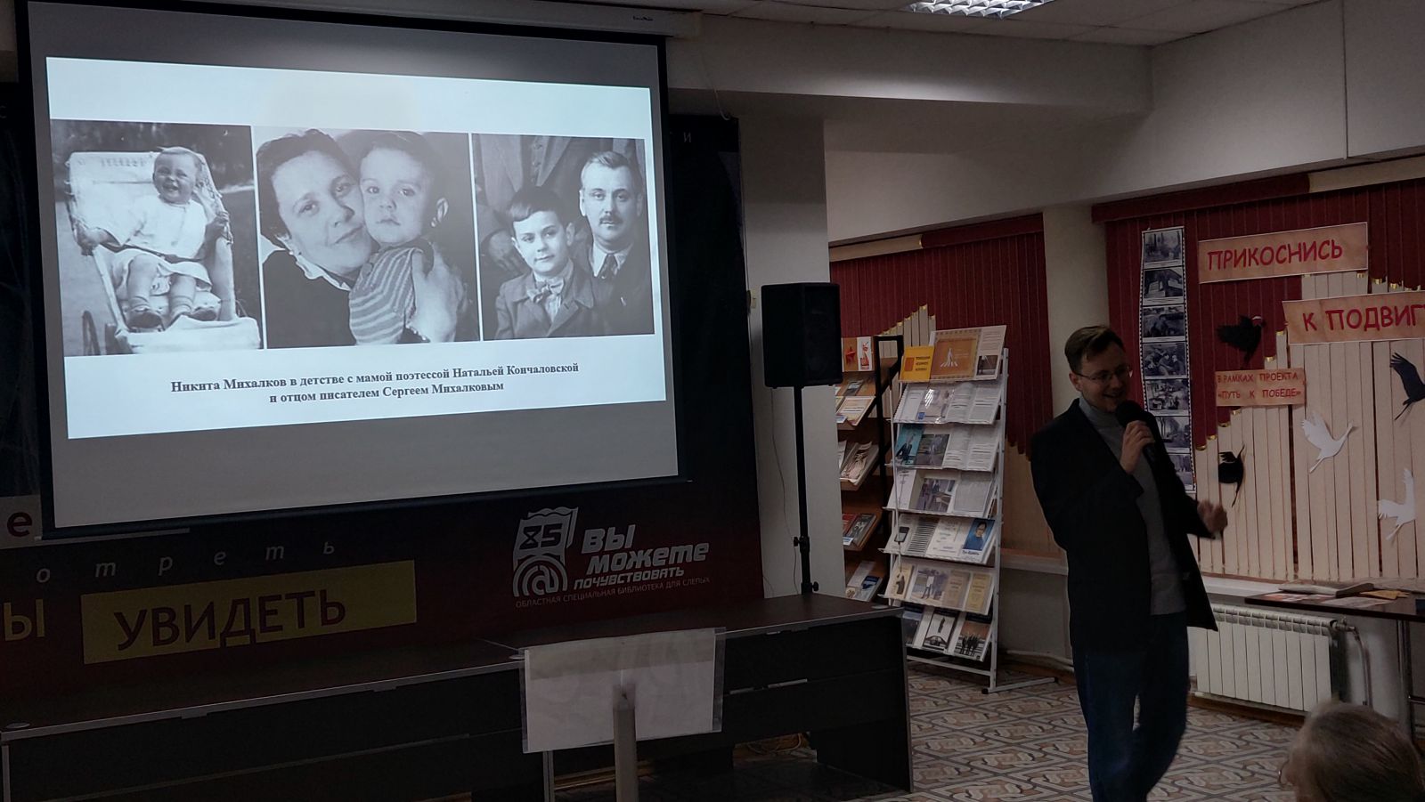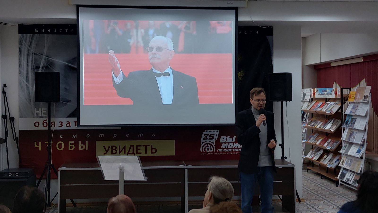 К 80-летнему юбилею Никиты Сергеевича Михалкова в Областной специальной библиотеке для слепых состоялась арт-встреча «Мир кино Никиты Михалкова», посвященная творчеству талантливого актера, режиссера, продюсера. Гости познакомились с жизнью и работой Михалкова, проследили путь становления его таланта и вспомнили самые значимые фильмы, среди которых «Я шагаю по Москве», «Свой среди чужих, чужой среди своих», «Утомленные солнцем», «Утомленные солнцем-2». Вспомнили фильмы «Раба любви», «Урга. Территория любви», «Солнечный удар». Посетители узнали некоторые факты о фильмах и ролях мастера, просмотрели отрывки и обсудили первую режиссерскую работу Никиты Сергеевича - фильм "Свой среди чужих, чужой среди своих".