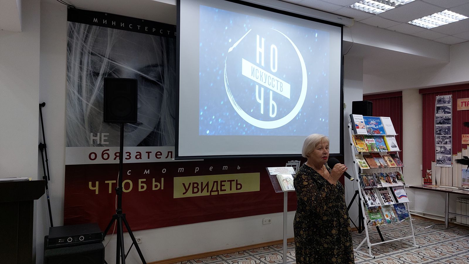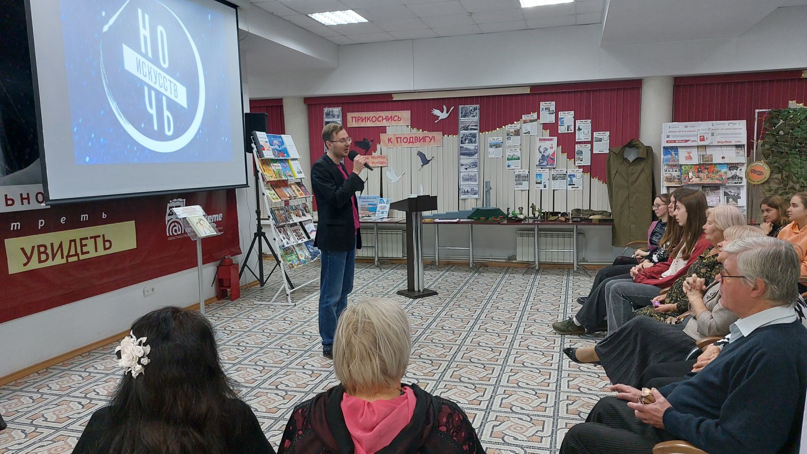 Зал был торжественно украшен. Были представлены тематические выставки. В приветственном слове директор библиотеки Ольга Новикова отметила, что в этом году ежегодная акция «Ночь искусств» проходит в Год 80-летия Великой Победы и в Год защитника Отечества. Она напомнила, что первыми, кто откликнулся на второй день Великой Отечественной войны, были художники-плакатисты. Среди первых плакатов Великой Отечественной войны стал плакат художника Ираклия Тоидзе «Родина-мать зовёт!». Всем присутствующим напомнили историю создания песни «Священная война», которую исполнили 26 июня на Белорусском вокзале.