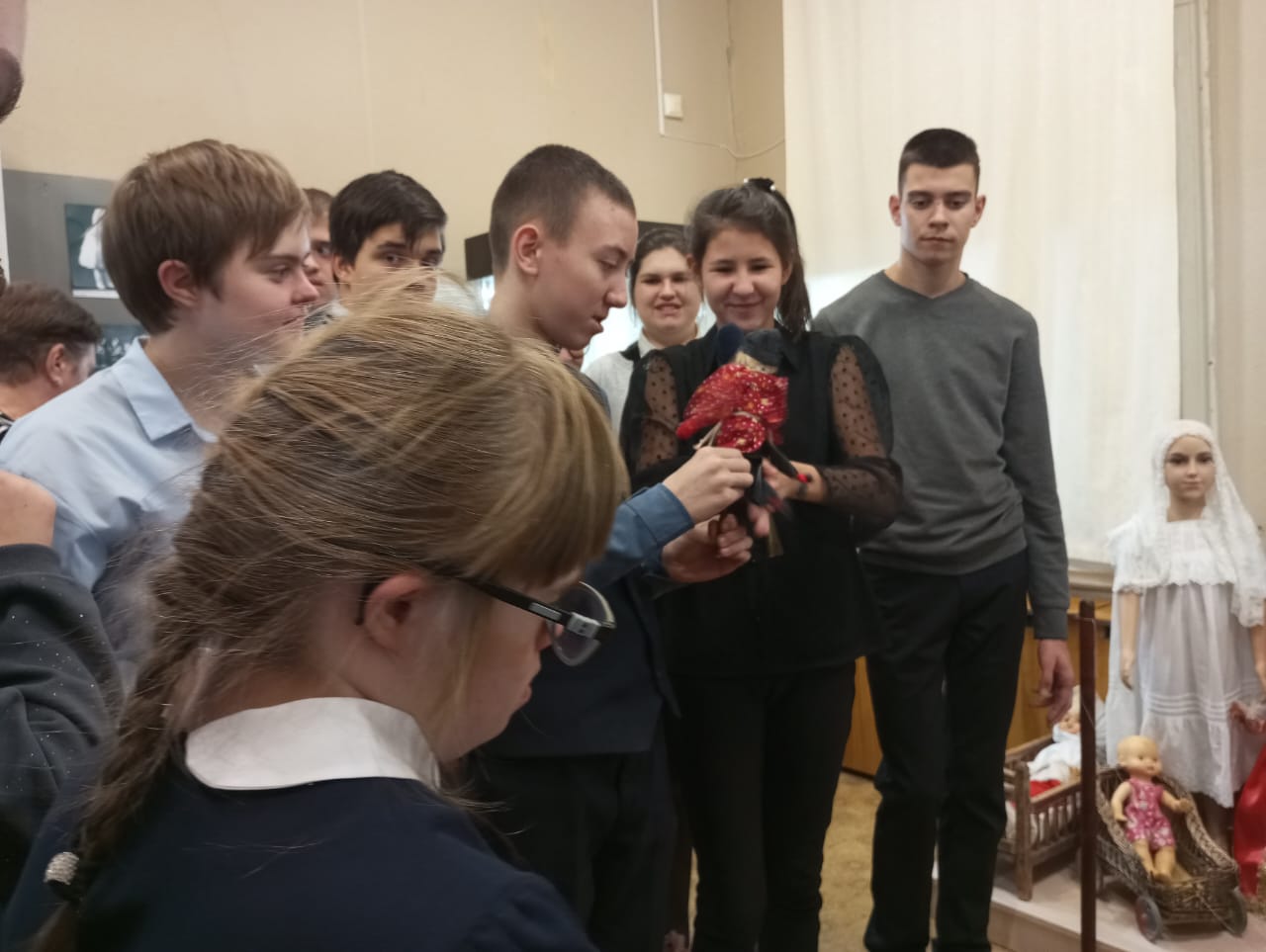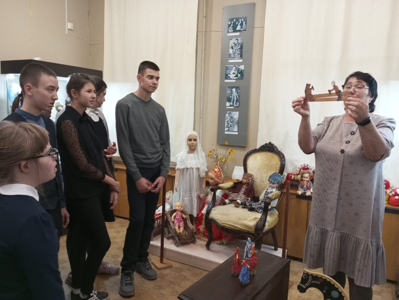 Несмотря на все тяготы войны, голод и разруху, игра присутствовала в жизни каждого ребёнка даже в военное время. Для детей войны игрушка была другом, оберегом, символом мирной жизни. Экспозиция «Время играть» познакомила школьников с игрушками военных лет, дети узнали об играх военных и послевоенных лет, экспонаты выставки – любимые многими игрушки – стали проводниками в прошлое. Большое впечатление произвели на ребят проигрыватель с советскими пластинками – сказками и песнями из мультфильмов и диафильм Бориса Емельянова «Гайдар и его команда».