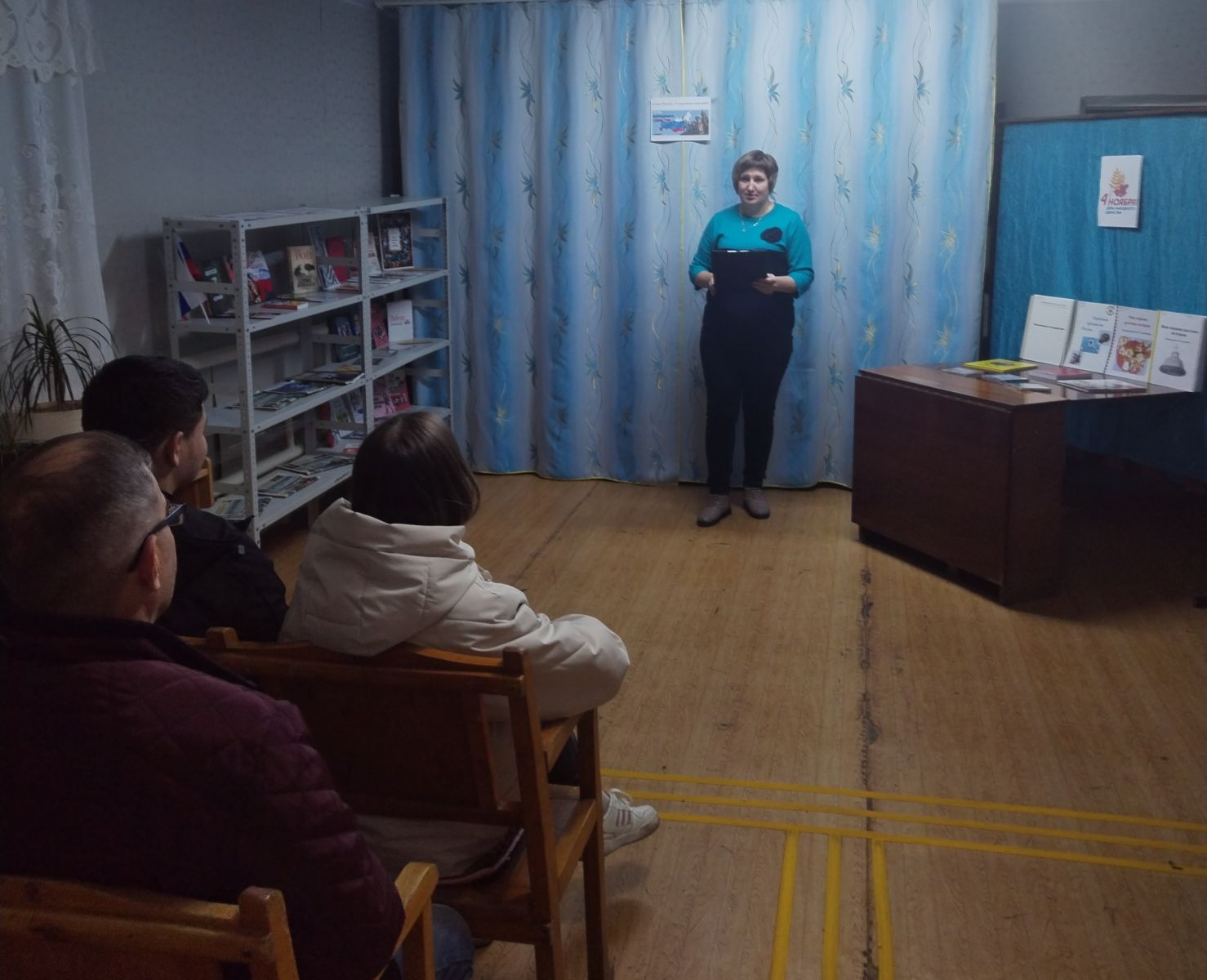 На мероприятии читатели и гости библиотеки познакомились с историей возникновения праздника, с русскими героями - Кузьмой Мининым и Дмитрием Пожарским, благодаря которым в России завершилось Смутное время и начался новый этап в истории. В завершении исторического экскурса читатели пришли к выводу, что сегодня, как никогда, мы должны стремиться к единству народов многонациональной России, поскольку единство и сплочённость - это путь к миру. Также читатели познакомились с обзором литературы в различных форматах по истории России и русского народа, с книгами о великих защитниках Руси великой, с важнейшими битвами и сражениями, а также с книгами о героизме и сплочённости многонационального народа России.