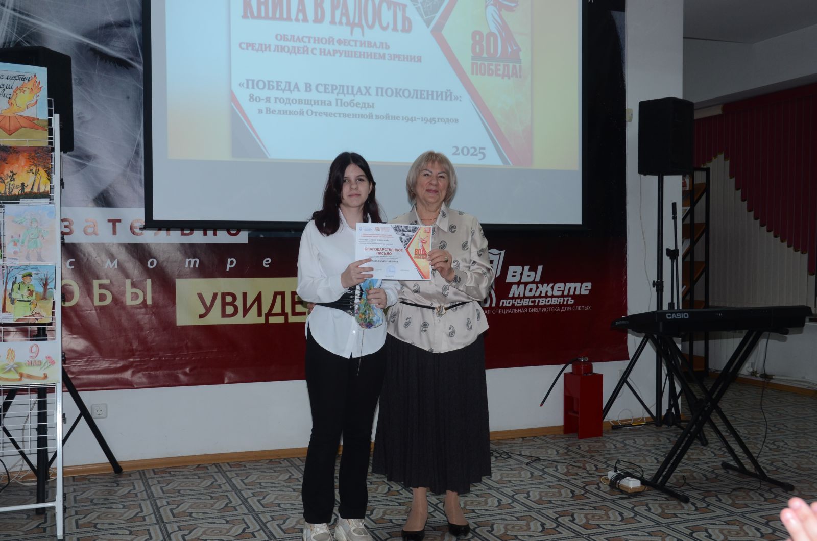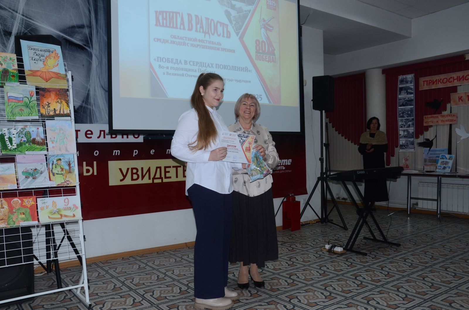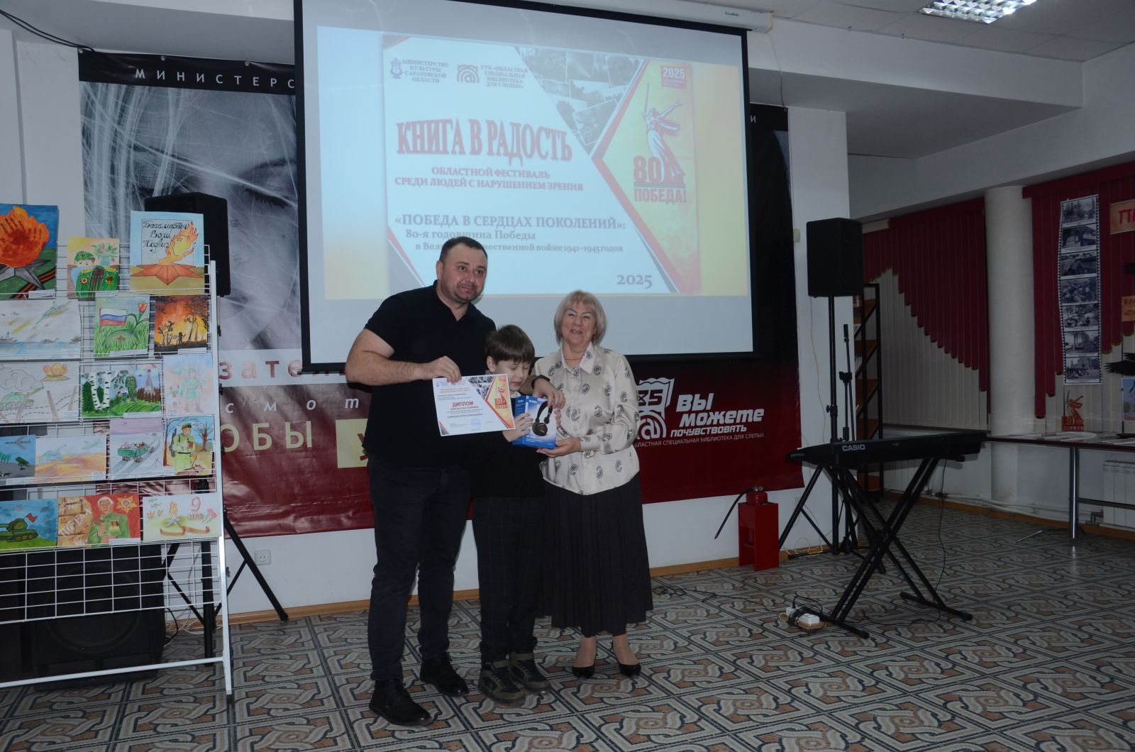 Наступил самый волнительный момент – торжественная церемония награждения областного фестиваля среди людей с нарушением зрения «Книга в радость». В 2025 году тема фестиваля – «Победа в сердцах поколений», фестиваль посвящён 80-й годовщине победы в Великой Отечественной войне 1941-1945 гг. Фестиваль проходил в течение года по четырём номинациям, а подведение итогов традиционно состоялось в Международный день инвалидов 3 декабря. Очень волнительным стал момент объявления победителей и наблюдения за искренними радостными эмоциями не только самих победителей, но и их родных и близких. Вместе со всеми радовались и волонтёры, которые присутствовали на церемонии награждения. В этом году количество победителей – 51 человек, из них 4 удостоены звания Лауреата. С огромной радостью победители получали заслуженную награду – диплом победителя и специальный приз.