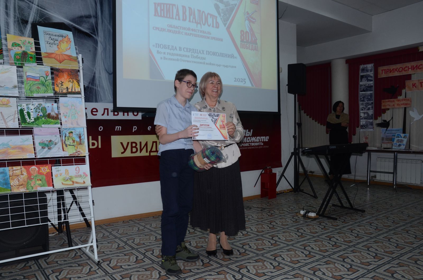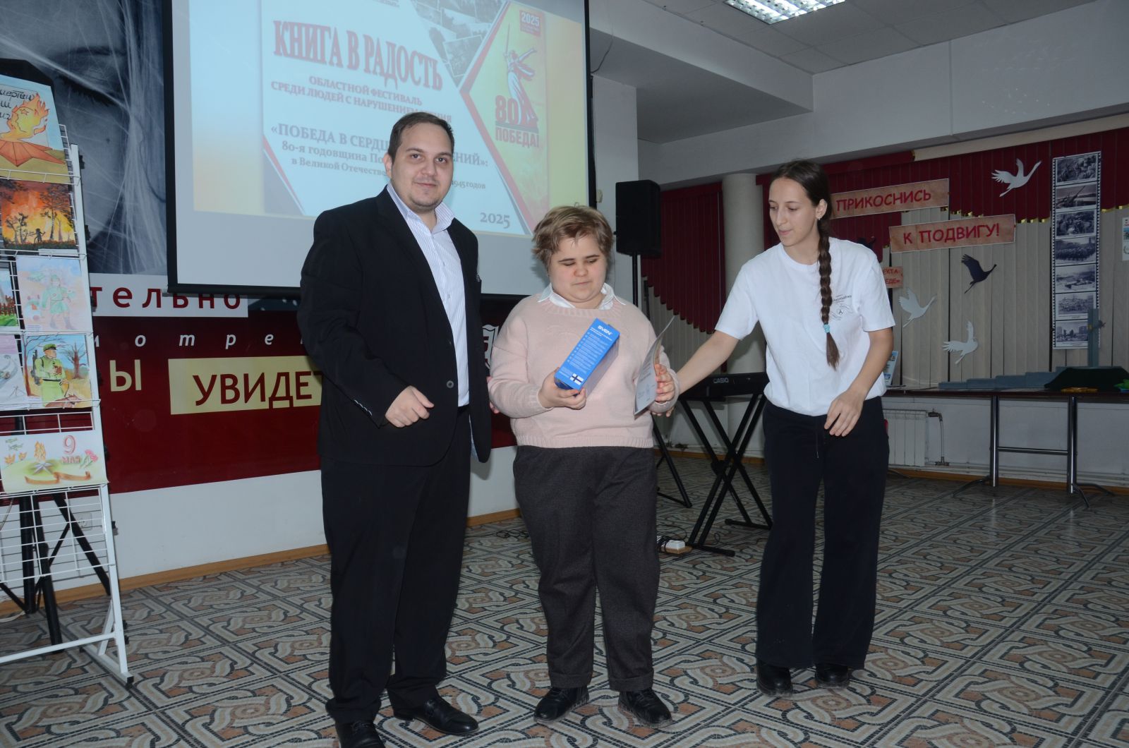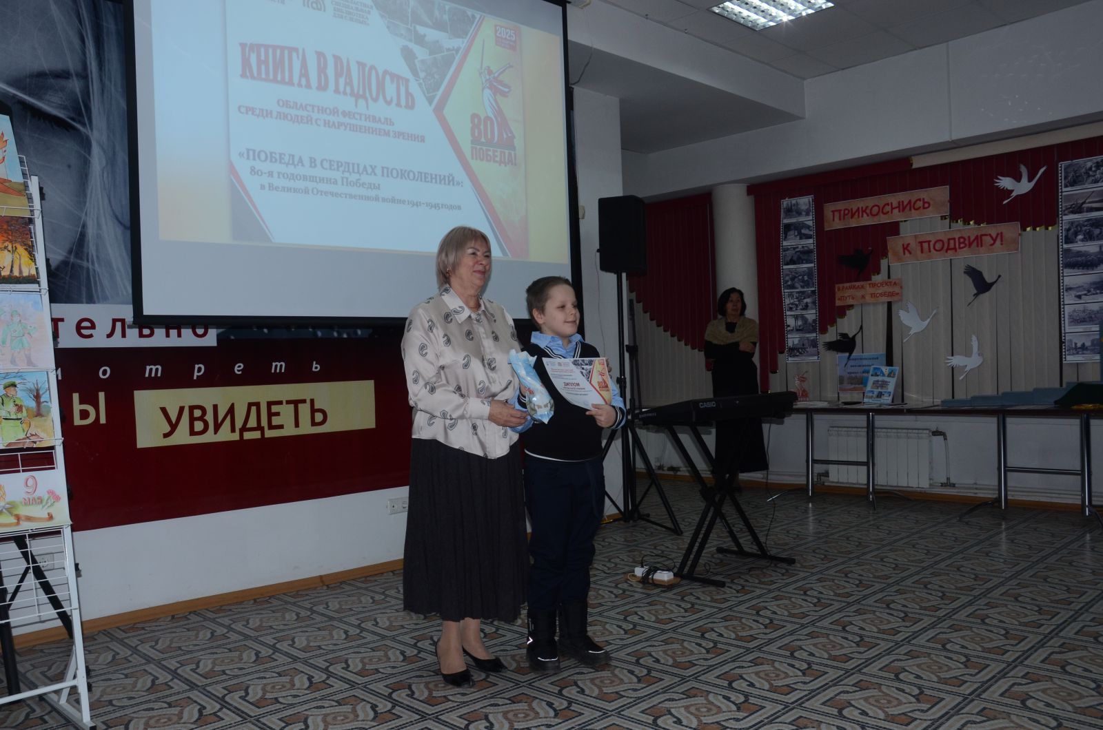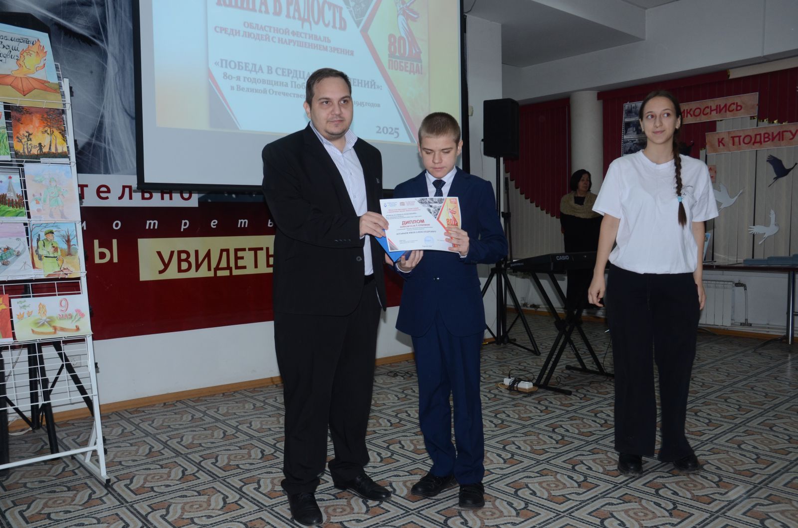 Наступил самый волнительный момент – торжественная церемония награждения областного фестиваля среди людей с нарушением зрения «Книга в радость». В 2025 году тема фестиваля – «Победа в сердцах поколений», фестиваль посвящён 80-й годовщине победы в Великой Отечественной войне 1941-1945 гг. Фестиваль проходил в течение года по четырём номинациям, а подведение итогов традиционно состоялось в Международный день инвалидов 3 декабря. Очень волнительным стал момент объявления победителей и наблюдения за искренними радостными эмоциями не только самих победителей, но и их родных и близких. Вместе со всеми радовались и волонтёры, которые присутствовали на церемонии награждения. В этом году количество победителей – 51 человек, из них 4 удостоены звания Лауреата. С огромной радостью победители получали заслуженную награду – диплом победителя и специальный приз.