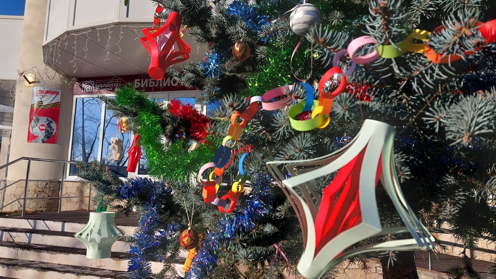 В Областной специальной библиотеке для слепых состоялась акция «Нарядим ёлку вместе», в рамках которой сотрудники библиотеки вместе с волонтёрам СГУ им Н.Г. Чернышевского украсили ёлочку на около библиотечной территории в Детском парке.