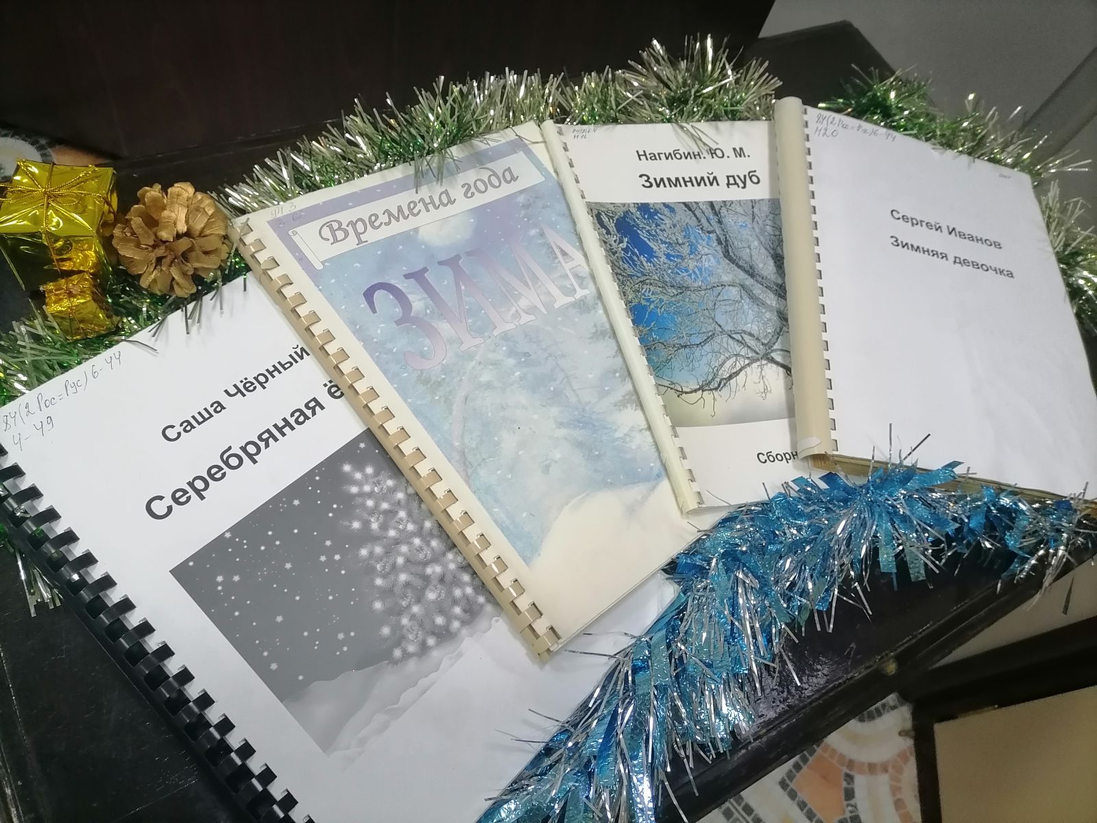 Среди них книги, изданные рельефно-точечным шрифтом Брайля: «Зимний дуб: сборник рассказов» Юрия Нагибина, «Зима: альманах для школьников», Саша Чёрный «Серебряная ёлка», «Зимняя девочка: рассказы и повесть» Сергея Иванова.