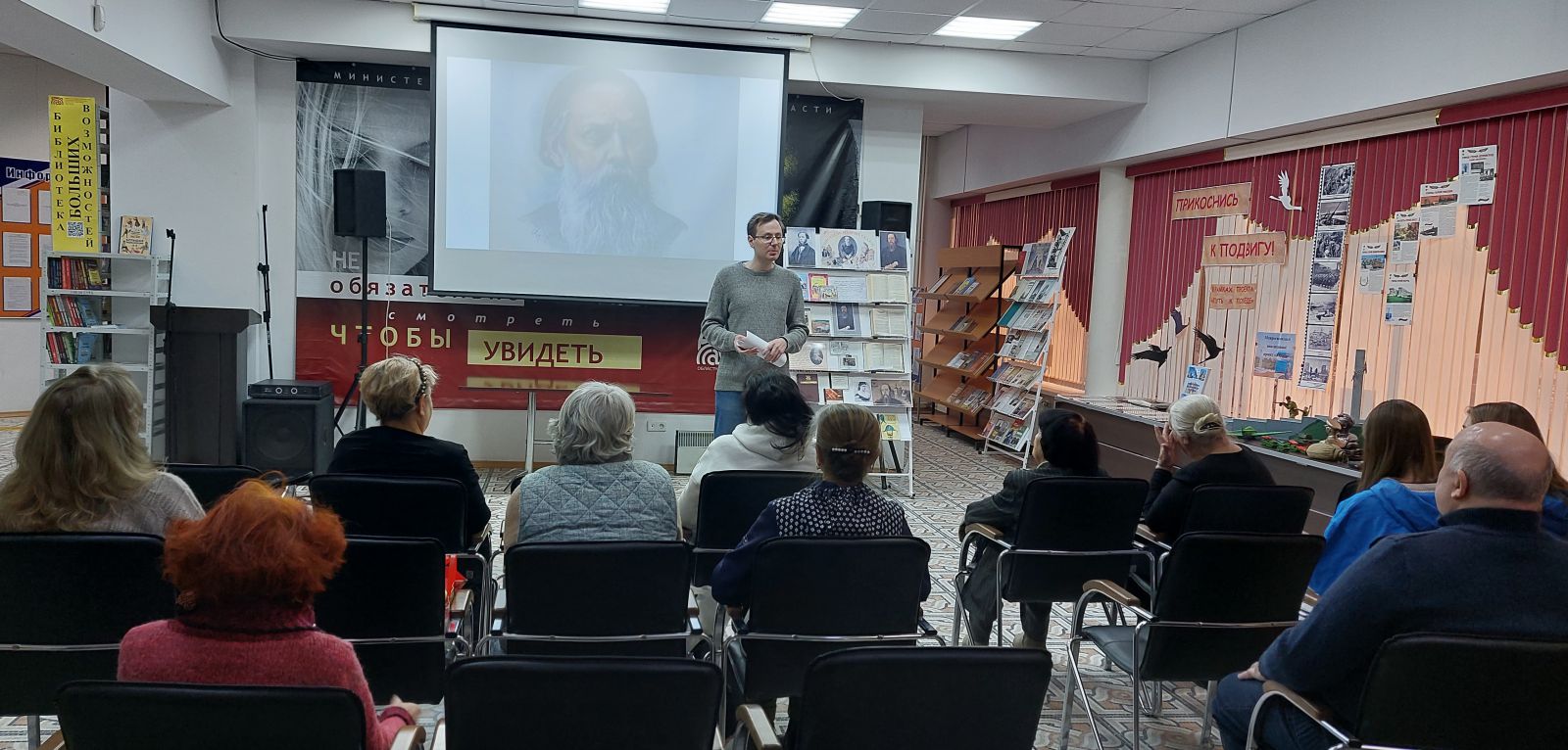В ходе встречи ведущий рассказал о важнейших этапах жизненного и творческого пути М.Е. Салтыкова‑Щедрина, раскрыл особенности его сатирического мастерства, проявившегося в иносказаниях и иронии – порой утончённой и зашифрованной, а порой хлёсткой и бескомпромиссной.