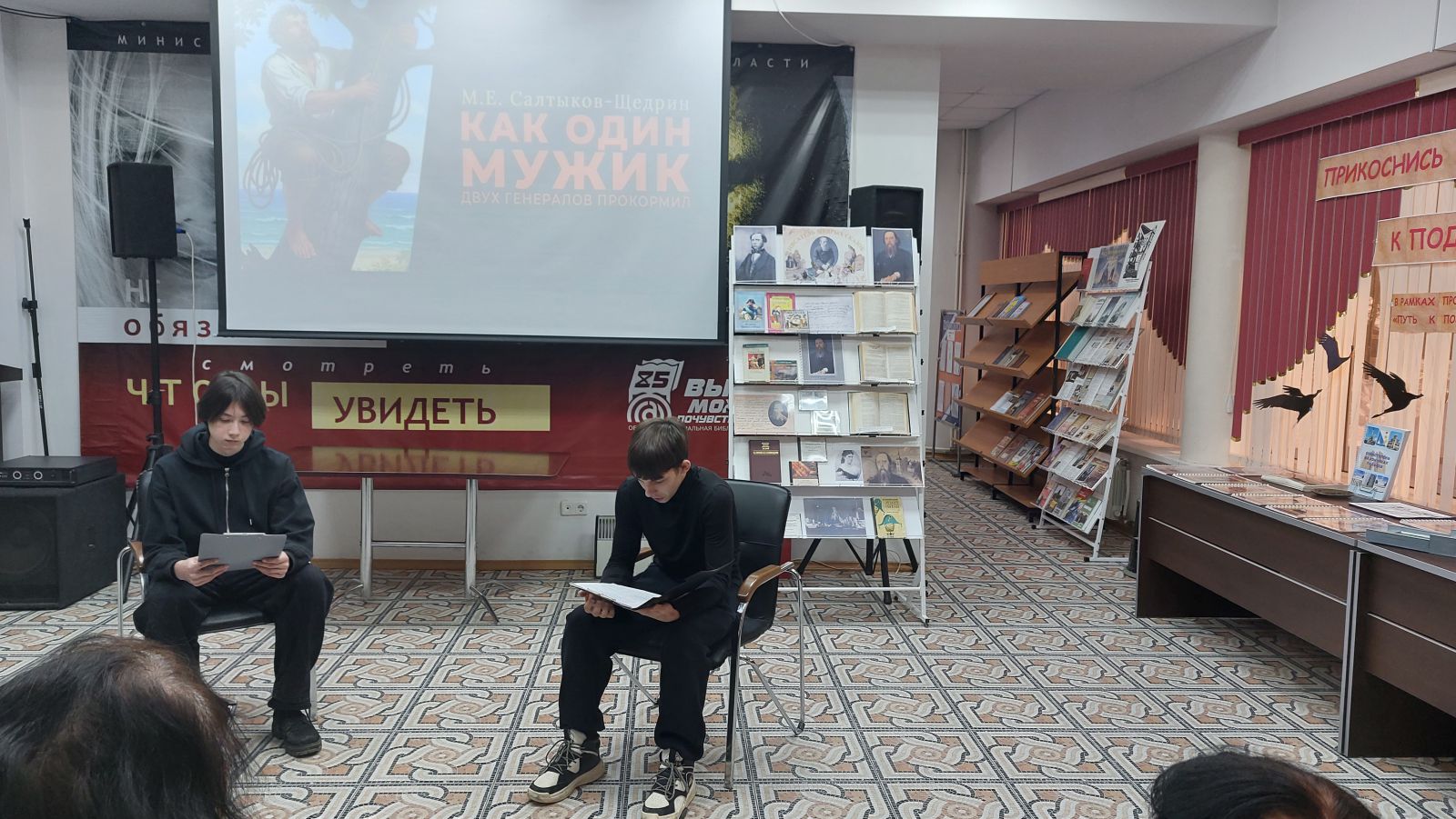 На мероприятии прозвучали отрывки из самых известных произведений писателя. Постоянный читатель библиотеки Елена Михайловна Волкова прочла сказку «Самоотверженный заяц». Очень душевно прозвучал отрывок из романа «Пошехонская старина» в исполнении воспитанницы Детско-юношеского центра Фрунзенского района г. Саратова Миланы Лебедевой. Сатирическая сказка Михаила Салтыкова-Щедрина «Повесть о том, как один мужик двух генералов прокормил» прозвучала в исполнении Александра Клочкова и Ростислава Мотрука воспитанников Детско-юношеского центра Фрунзенского района г. Саратова.
