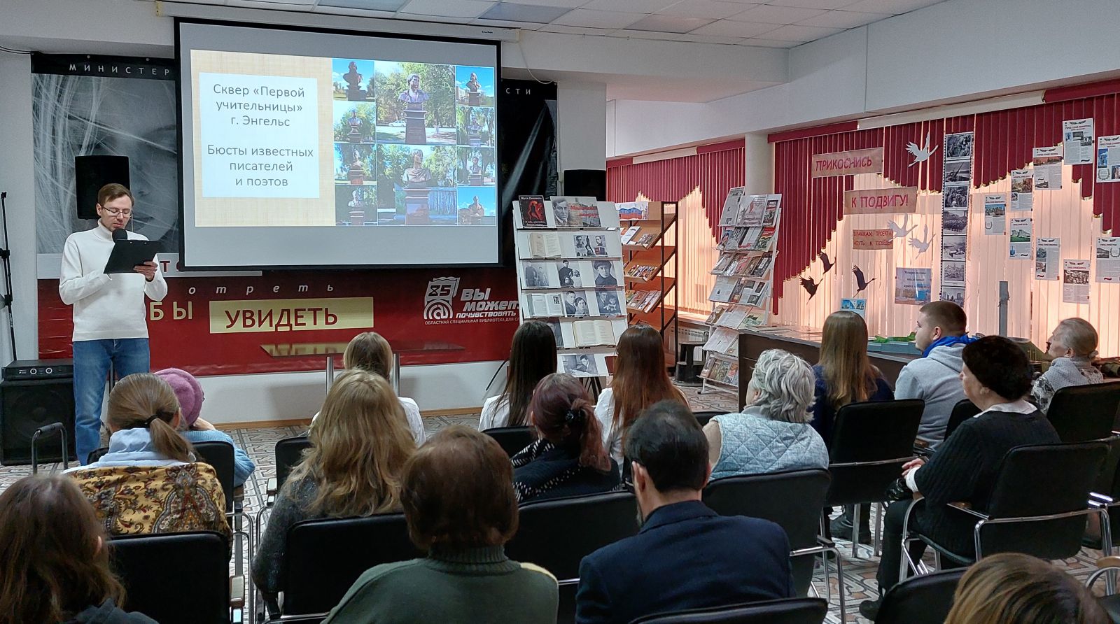 Коллеги из Казани выразили нам благодарность за возможность совершить виртуальную экскурсию по скверу «Первой учительницы и нематериального культурного наследия» в городе Энгельсе Саратовской области, где установлены бюсты знаменитых писателей и поэтов, среди них бюст Мусы Джалиля. Виртуальную экскурсию подготовил и провёл заведующий сектором социокультурной реабилитации инвалидов центра адаптивного чтения ГУК «Областная специальная библиотека для слепых» Артём Бондарев.