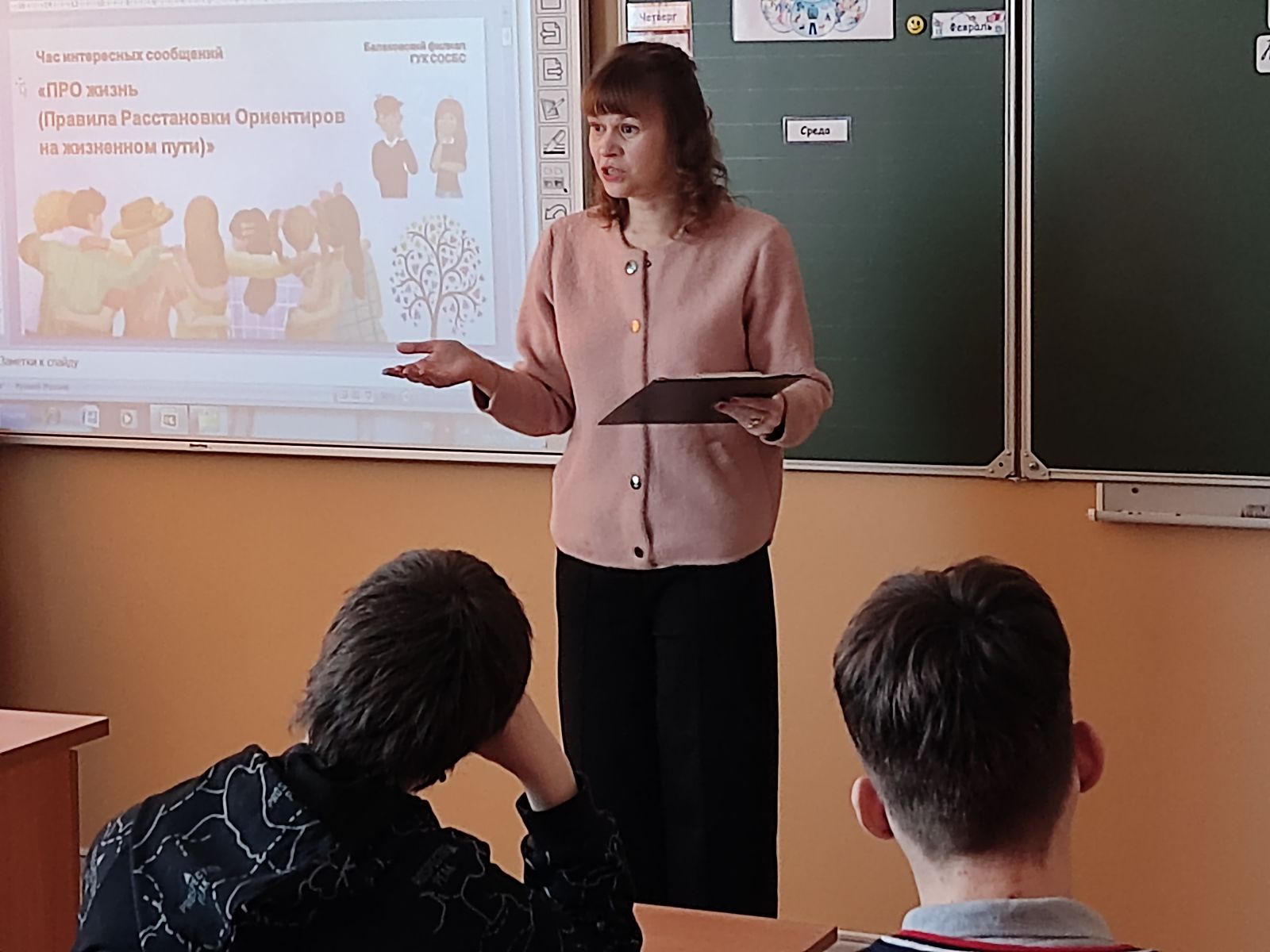 Балаковский филиал Областной специальной библиотеки для слепых подготовил для учащихся ГБОУ СО «Школа-интернат АОП г. Балаково» час интересных сообщений «ПРО жизнь (Правила Расстановки Ориентиров на жизненном пути)», рассказавший школьникам, что такое человеческие ценности и жизненные ориентиры.