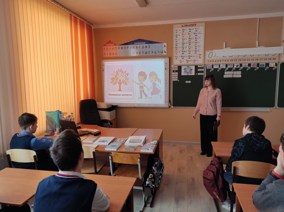 В ходе мероприятия «ПРО жизнь …» шло обсуждение того, что помогает формированию ценностных ориентиров и достижении жизненных целей - отношения к здоровью, семье, Отечеству, культуре, природе. Школьники заполнили таблицу приоритетов, выбирая каждый для себя самую важную ценность, рассказали, что больше всего ценят в людях, посмотрели видео «Ценности, которые нас объединяют», «Что значит быть настоящим другом», ознакомились с книгами библиотеки о самых важных человеческих ценностях.