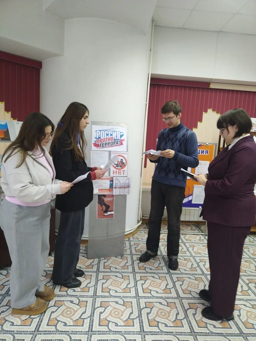 Центр социально-значимой и правовой информации Областной специальной библиотеки для слепых провёл акцию, направленную на профилактику и борьбу с терроризмом «Россия против террора». В рамках акции подготовлены и розданы информационные буклеты, содержащие в себе понятие «терроризм», памятки действий при угрозе террористического акта. Участниками акции стали читатели библиотеки, студенты, волонтёры.